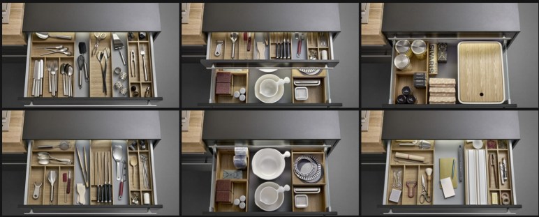Grâce à L-BOX et ses différents modules vous pourrez entièrement adapter l’aménagement des éléments de votre cuisine à vos besoins. Le fond des tiroirs et des coulissants est ici entièrement revêtu d’un tapis gris carbone antidérapant très facile d’entretien. Des séparateurs, porte-couteaux et compartiments en chêne laqué naturel de différentes tailles sont placés de manière à répondre à vos besoins et à créer un jeu de couleurs entre le bois et le carbone. Les espaces libres sur le tapis antidérapant offrent des surfaces de rangement supplémentaires.