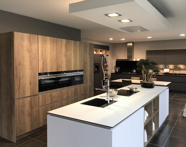 Un ensemble d’armoires modèle Synthia-C coloris Chêne Lime – intégrant le réfrigérateur, les fours ainsi que de nombreux rangements – est associé à un îlot modèle Ceres-C couleur Blanc Arctique.