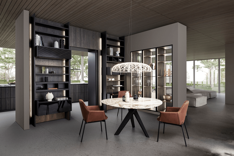 Bois véritable, laques mates, verre et minéraux créent des contrastes raffinés. Les compositions associent surfaces fermées et modules ouverts pour une ambiance chaleureuse, structurée et vivante.