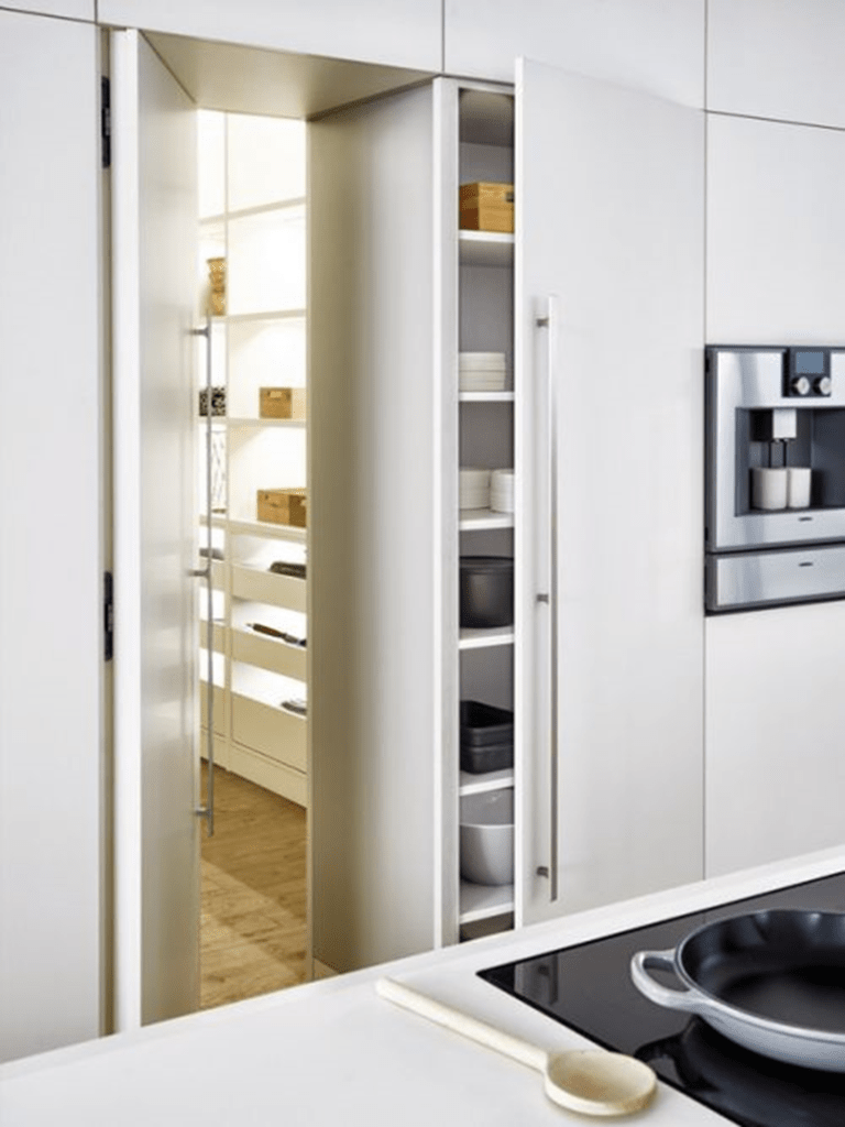 Portes à passage intégré, alignements de façades, et finitions coordonnées permettent des transitions discrètes entre cuisine, cellier et pièces attenantes. Résultat : un plan d’ensemble fluide, où chaque volume s’inscrit dans l’architecture du lieu.