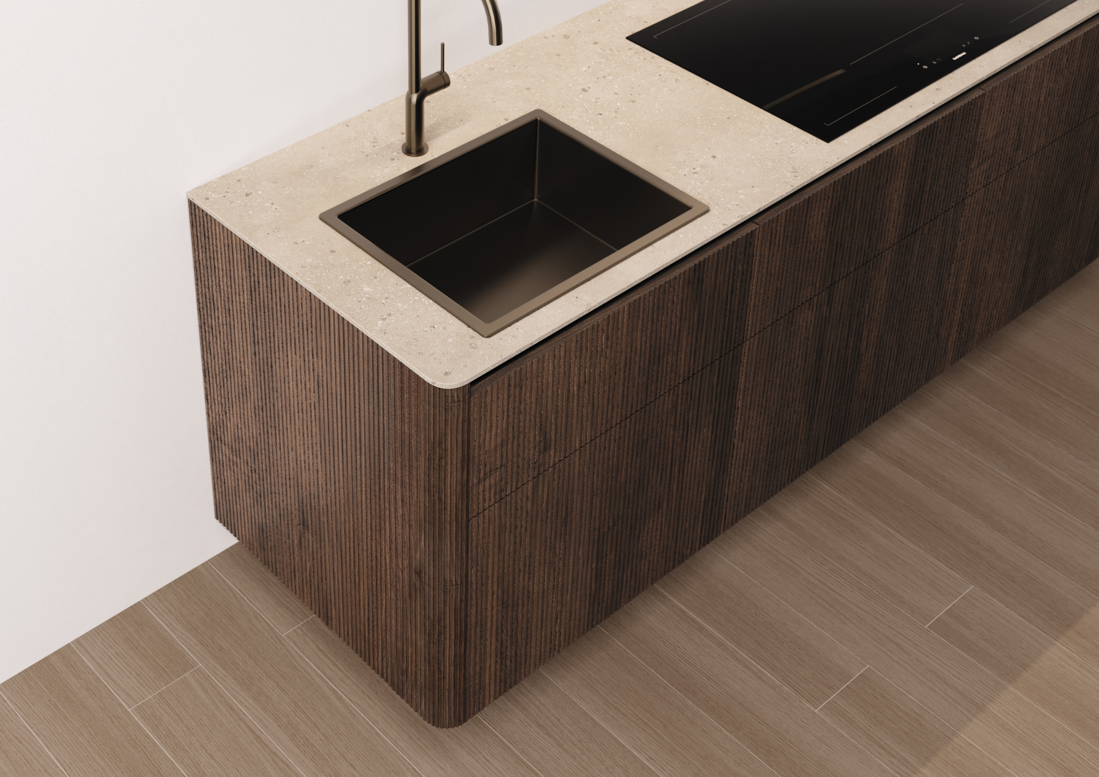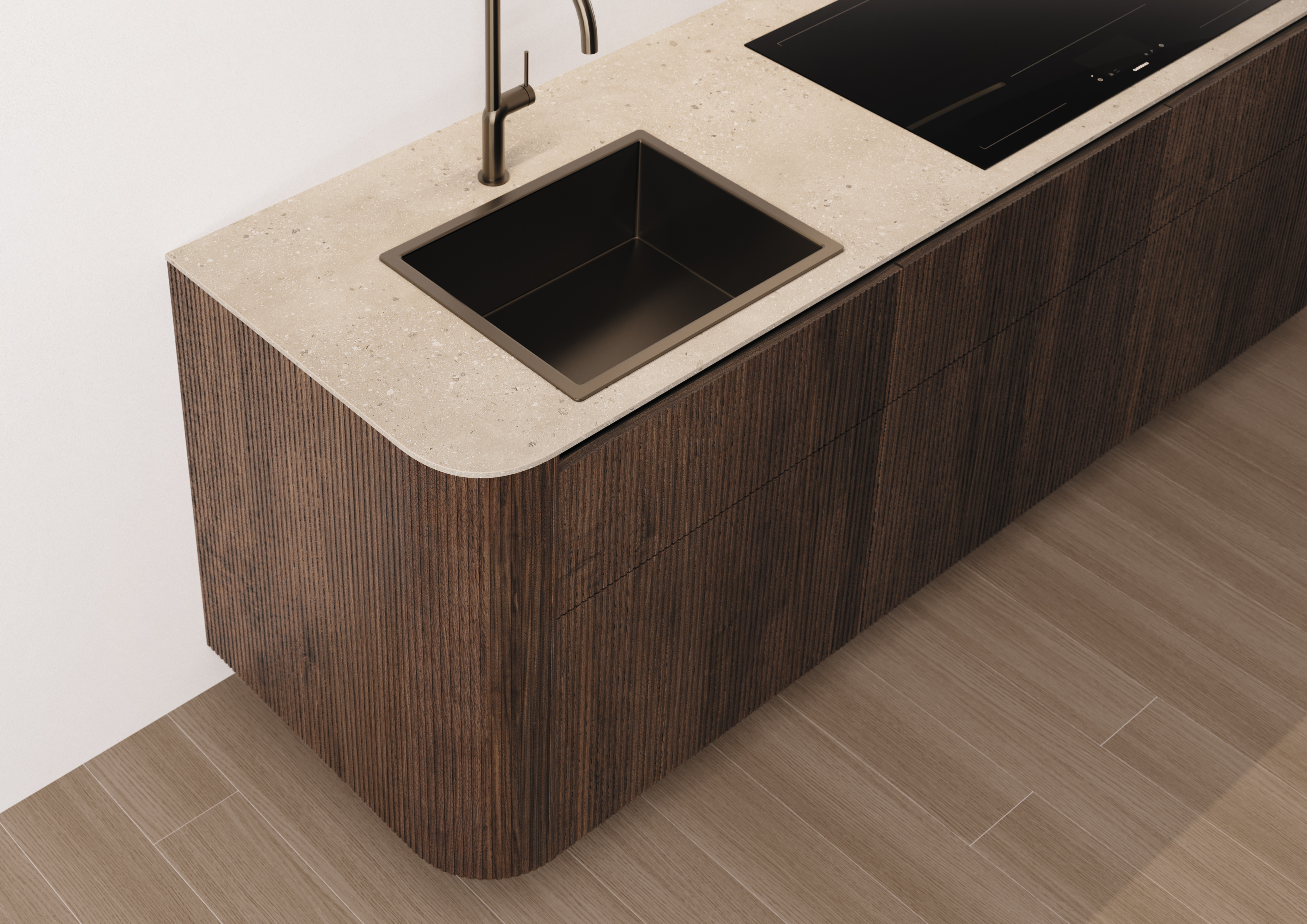 Les joues arrondies s’adaptent à toutes les finitions : laques mates ou brillantes, placages bois. Le résultat est un équilibre subtil entre chaleur naturelle et rigueur géométrique. Chaque projet devient unique, façonné selon le style de vie et les préférences esthétiques du client.
